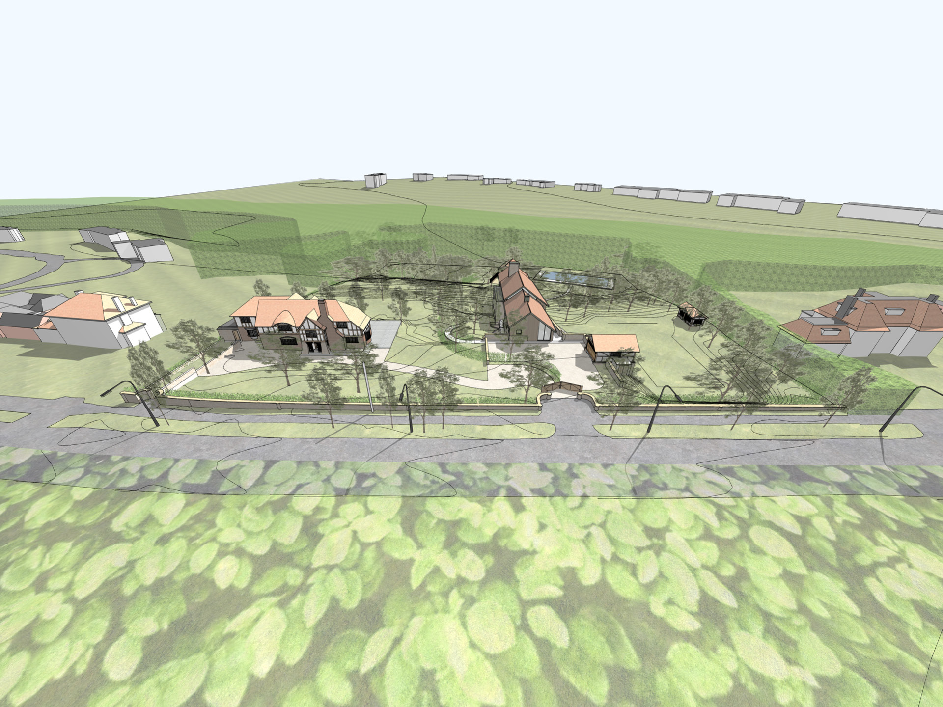 The aspirational principles for the architectural design are set by a brief to target the RIBA 2030 Climate Challenge for operational energy, embodied carbon and water use reduction. The proposed dwelling has been sympathetically designed and considered in response to its local context; to become a development of high quality and exemplar aesthetical merit. The house has been located to sit comfortability on the site in keeping with the scale, materials and character of the local area whilst offering a degree of respectful modernity and contemporary style. The proposals will positively enhance the character and appearance of the site and enhance the overall setting in this Area of Special Character. The building has been robustly considered with involvement from other professional consultants, to provide solutions designed to be future proofed to emerging environmental and sustainability targets.